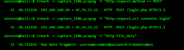 http.file_data reveals form submissions — in this case, a username and password being POSTed in plaintext. That’s a major data leak. No SSL, no TLS, and an attacker sniffing the wire could steal credentials just like this.
