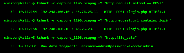 We start by isolating a 3-minute PCAP capture from the user’s machine. The file was named capture_1106.pcapng and opened in both Wireshark and CLI tools.