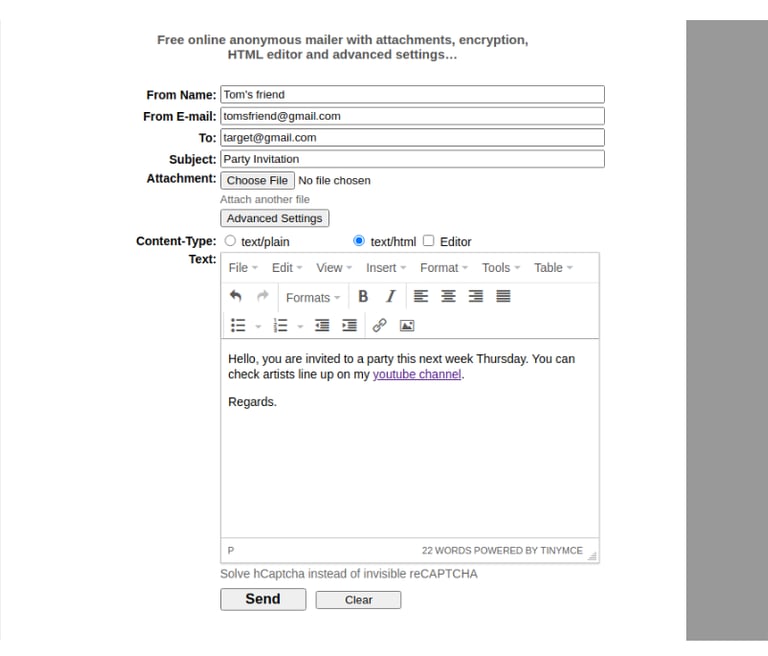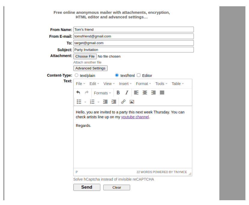 On our extra step we will learn on how to use a free online email service to send a phishing email to our target. We will embed the phishing link we generated to an email we will send to the victim. As we learned earlier, emails can be spoofed easily to look like they come from a legitimate source. In this step we will use a free tool (emkei.cz) available online to send the email. We open the webpage and everything required is on the home page as shown below.